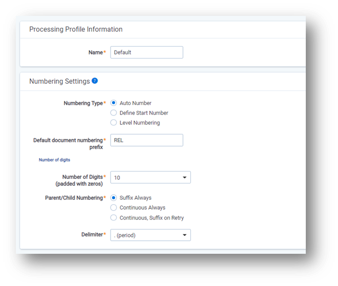 As with other areas in the Relativity world you first need to set a profile, in this case a processing one. The first part of the profile determines how the numbering will work.
