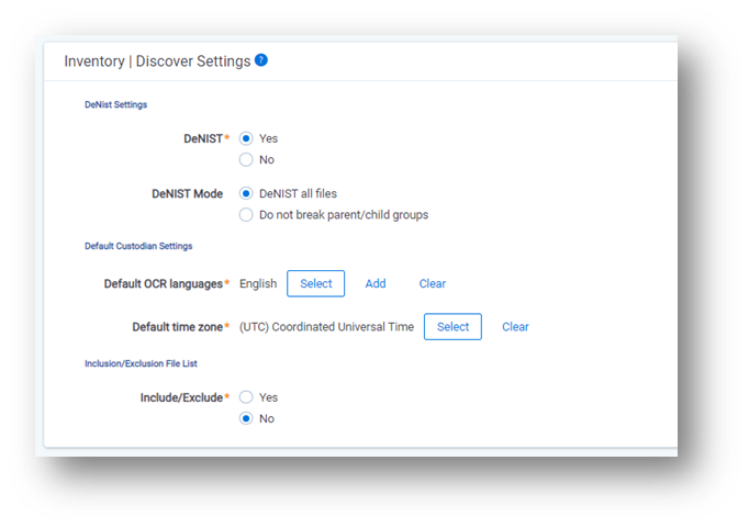 Inventory and Discover settings are limited to DeNISTing, OCR languages and Timezone and the ability to include or exclude certain file types.