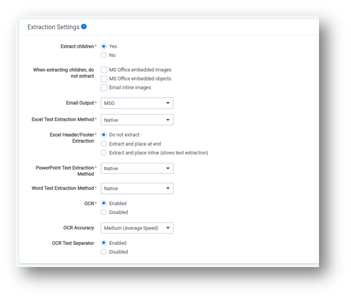 Extraction settings are as complex as it gets for Relativity processing. In this section you determine how to handle child documents, format of Email output, Excel, PowerPoint and Word files extraction methods and OCR settings.