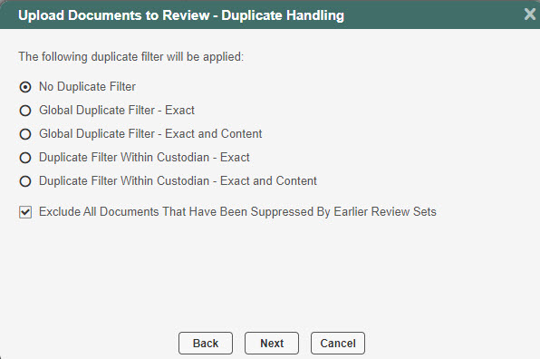 When moving the data out of the Data Archive there is an option to reduce the set size by de-duping; whether pushing the data into Search and Cull or Document Review.