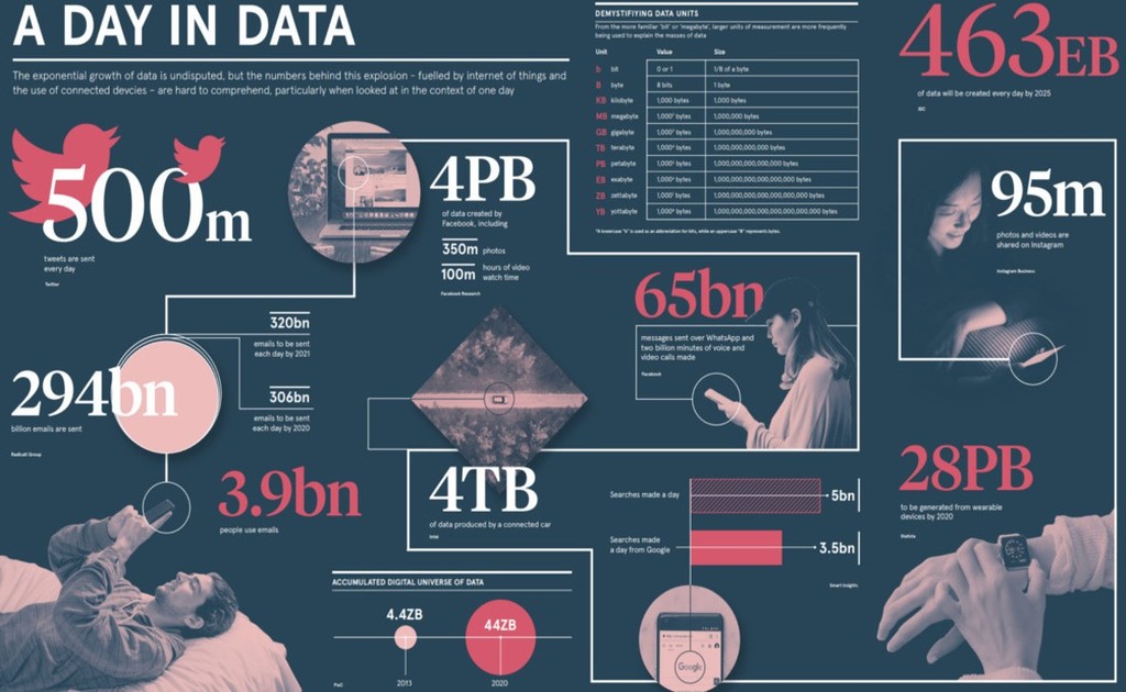 Stuart explains during the webinar that we are now producing the same amount of data every two days that we did from the beginning of time up to 2003. That is just mind blowing. The info graphic above also shows us that in 2013 the accumulated digital universe of data was 4.4ZB (zettabytes), by the end of this year (2020) it is expected to have grown to 44ZB. In seven years the total volume of data has grown by ten times.